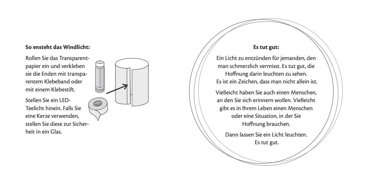 Über dieses Formular können Sie weitere Windlichter kostenlos bestellen. Sie erhalten einen Umschlag mit fünf Manschetten aus Transparentpapier, die Sie zusammenkleben müssen, um ein LED-Teelicht oder ein Teelicht im Glas hineinstellen zu können.